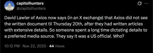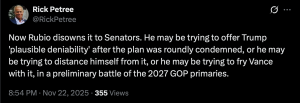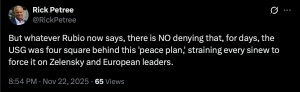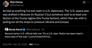 The fallout over Nick Schifrin’s Saturday scoop concerning Trump’s supposed 28-point ‘peace plan’ for Ukraine – that apparently is a Russian-written document – continues to reverberate in the Beltway. Mediate reports: