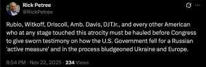 Full @SenatorRounds: “@SecRubio did make a phone call to us this afternoon. I think he made it very clear to us that we are the recipients of a proposal that was delivered to one of our representatives. It is not our recommendation, it is not our peace plan. It is a proposal that was received. And as an intermediary, we have made arrangements to share it. And we did not release it. It was leaked. It was not released by our members or our representatives… This is an opportunity to receive it and that it has been utilized and delivered to the Ukrainians, and that they will have an opportunity to respond. And in doing so, you now have one side being presented and the opportunity for the other side to respond.”