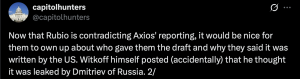 Sen. Mike Rounds (R-ND), according to PBS NewsHour reporter Nick Schifrin, said Rubio called him and other lawmakers to make it “very clear to us that we are the recipients of a proposal that was delivered to one of our representatives. It is not our recommendation, it is not our peace plan.”