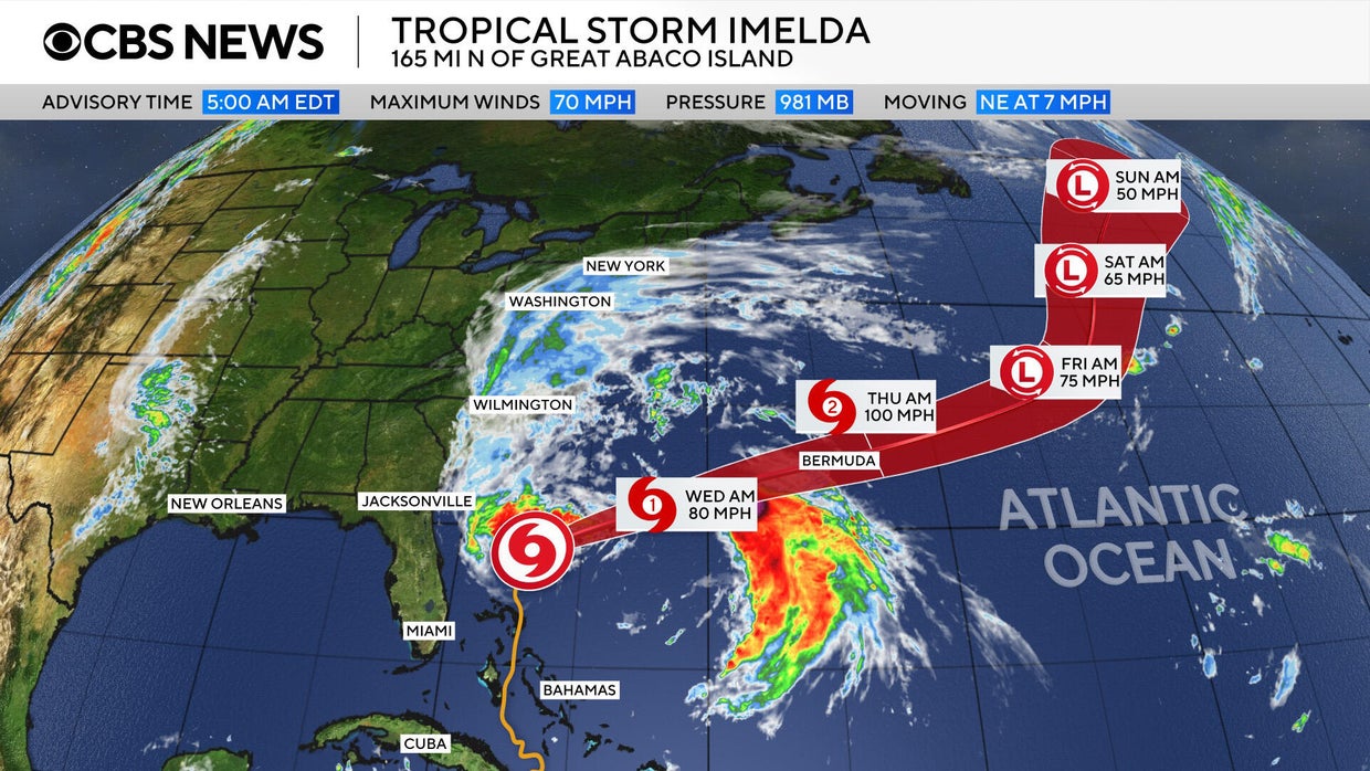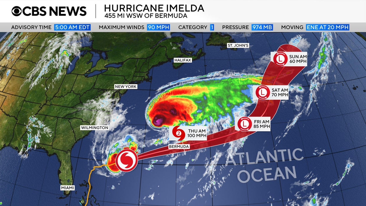 Imelda approaches Bermuda as a Category 1 hurricane. Maps show its forecast path.